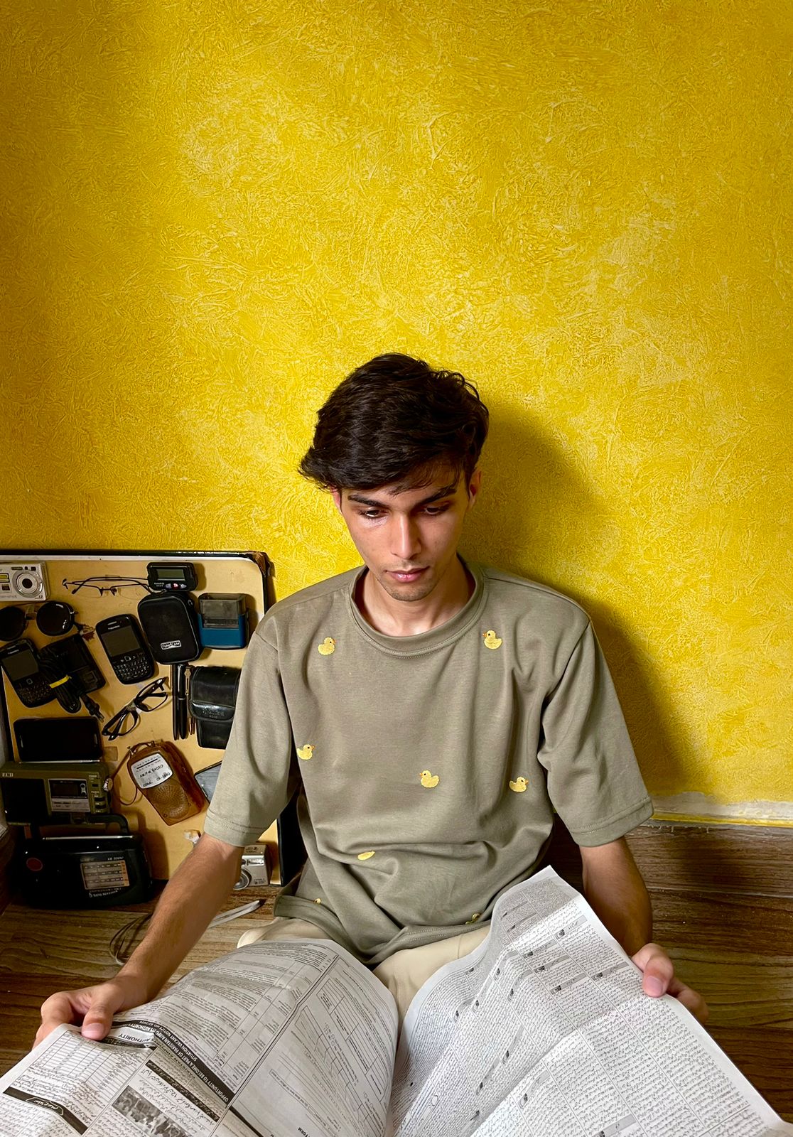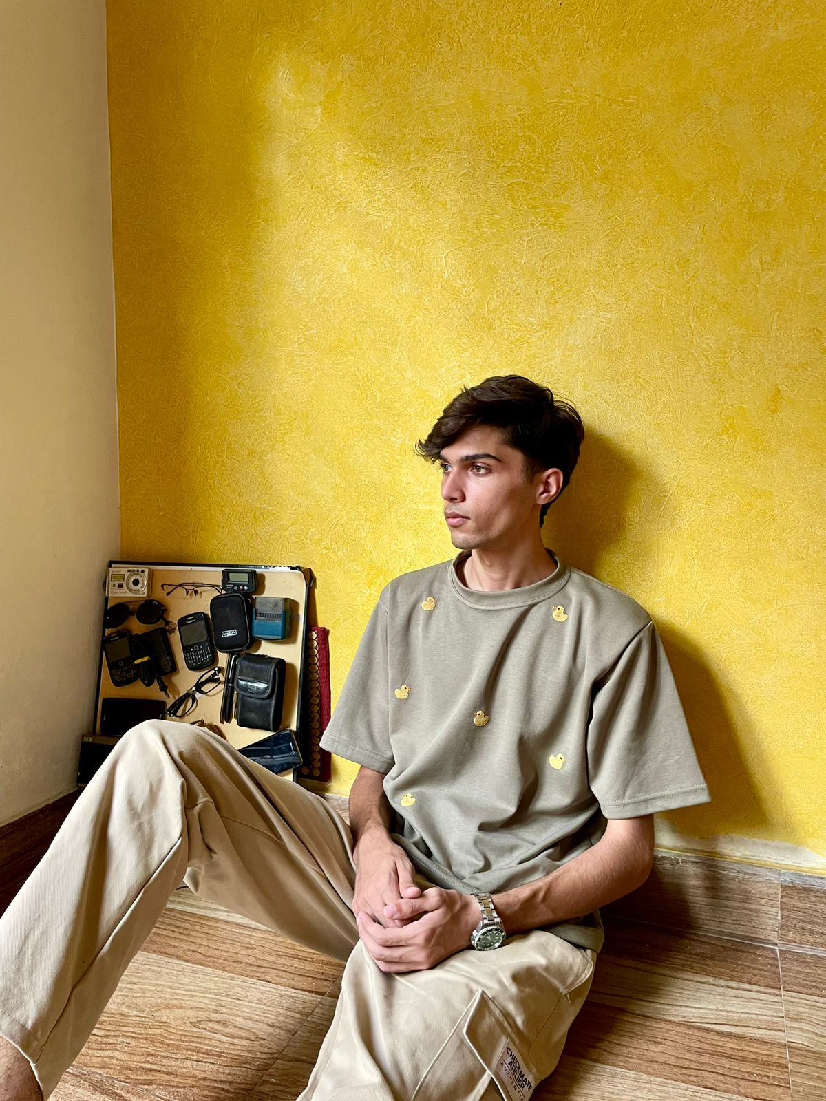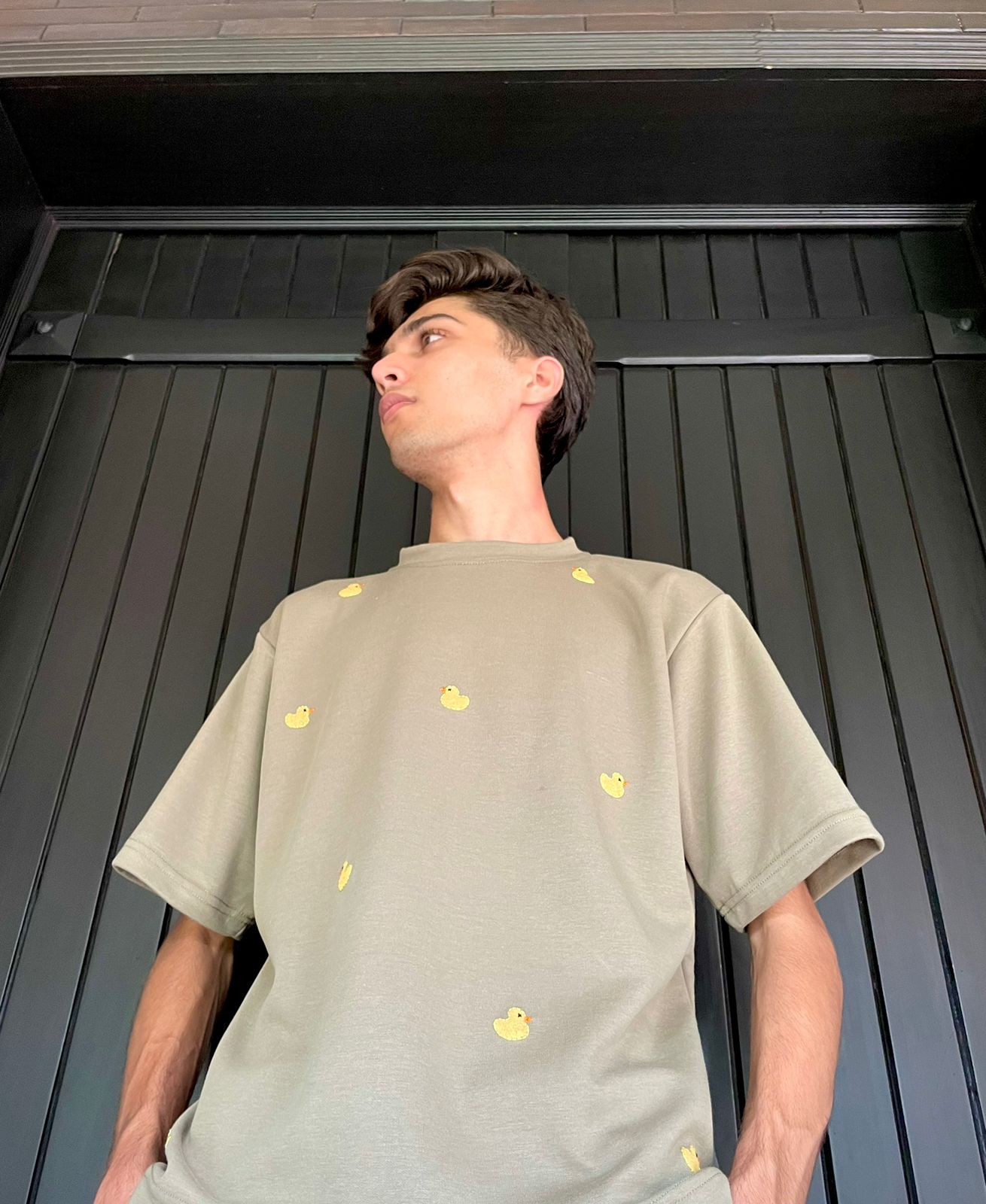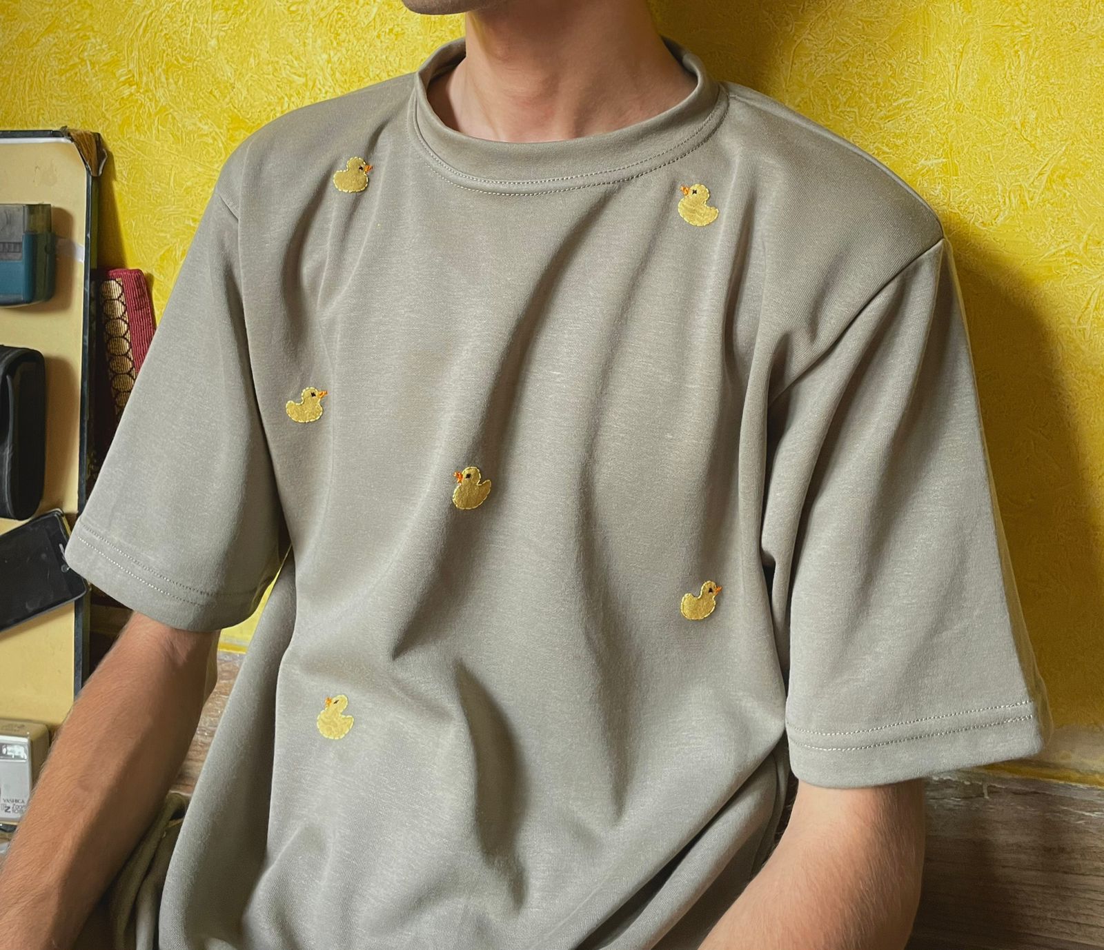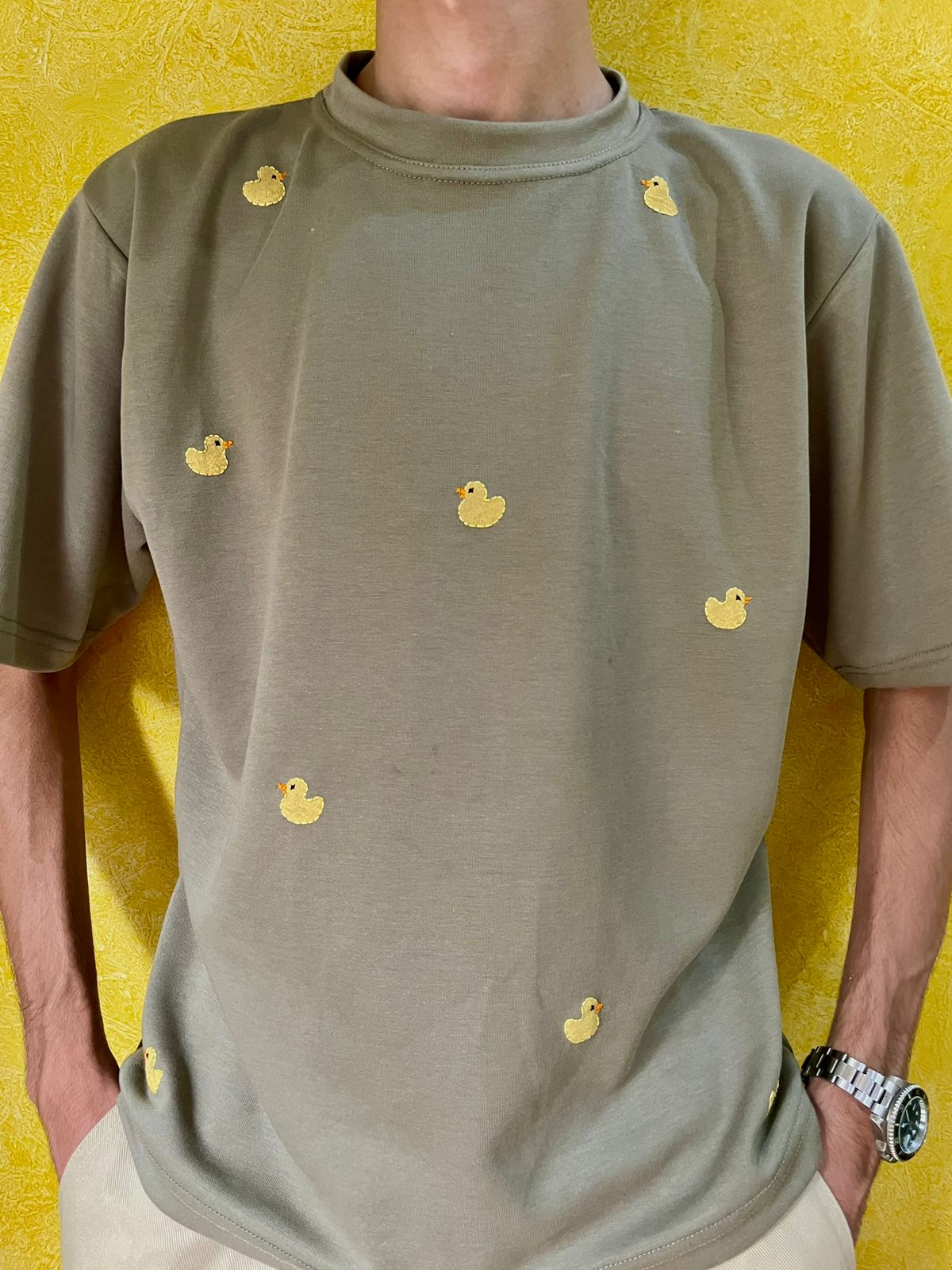 100% cotton jersey, featuring a unique hand-block printed design and intricate embroidery of a yellow rubber duck.